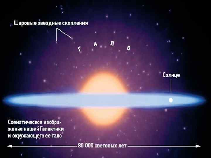 ГАЛО: “зовнішня оболонка” Галактики, більш розріджена; сферичної форми; межі Молочного Шляху визначаються розмірами гало; складається переважно з дуже старих, неяскравих зірок, які зустрічаються поодинці та у скупченнях. Зірки і скупчення рухаються навколо центру по витягнутим орбітам дуже повільно