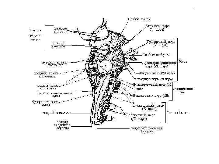 Ствол мозга включает продолговатый мозг, мост, средний мозг, промежуточный мозг и мозжечок. Ствол мозга выполняет следующие функции: 1) организует рефлексы, обеспечивающие подготовку и реализацию различных форм поведения; 2) осуществляет проводниковую функцию: через ствол мозга проходят в восходящем и нисходящем направлении пути, связывающие между собой структуры ЦНС; 3) при организации поведения обеспечивает взаимодействие структур между собой, со спинным мозгом, базальными ганглиями и корой большого мозга, т. е. обеспечивает ассоциативную функцию. Мозжечок Мост