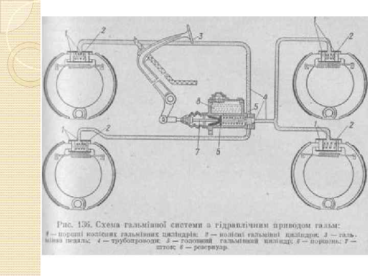 4. Загальна будова гальмівної системи: Гальмівний механізм передніх коліс; 2. Гальмівний механізм задніх коліс; 3. Гідравлічний привід. 1.