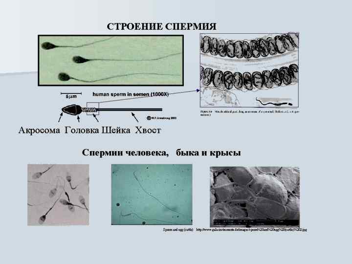 n n Сперматозоид млекопитающих имеет форму длинной нити. Длина сперматозоида человека 50– 60 мкм. В строении сперматозоида можно выделить «головку» , «шейку» , промежуточный отдел и хвостик. В головке находится ядро и акросома. Ядро содержит гаплоидный набор хромосом. Акросома — мембранный органоид, содержащий ферменты, используемые для растворения оболочек яйцеклетки. В шейке расположены две центриоли, в промежуточном отделе — митохондрии. Хвостик представлен одним, у некоторых видов — двумя и более жгутиками. Жгутик является органоидом движения и сходен по строению со жгутиками и ресничками простейших. Для движения жгутиков используется энергия макроэргических связей АТФ, синтез АТФ происходит в митохондриях. Сперматозоид открыт в 1677 году А. Левенгуком. Сперматозоиды: 1 - кролика; 2 крысы; 3 - морской свинки: 4 человека; 5 - десятиногого рака; 6 паука; 7 - жука; 8 - хвоша; 9 - мха; 10 - папоротника.