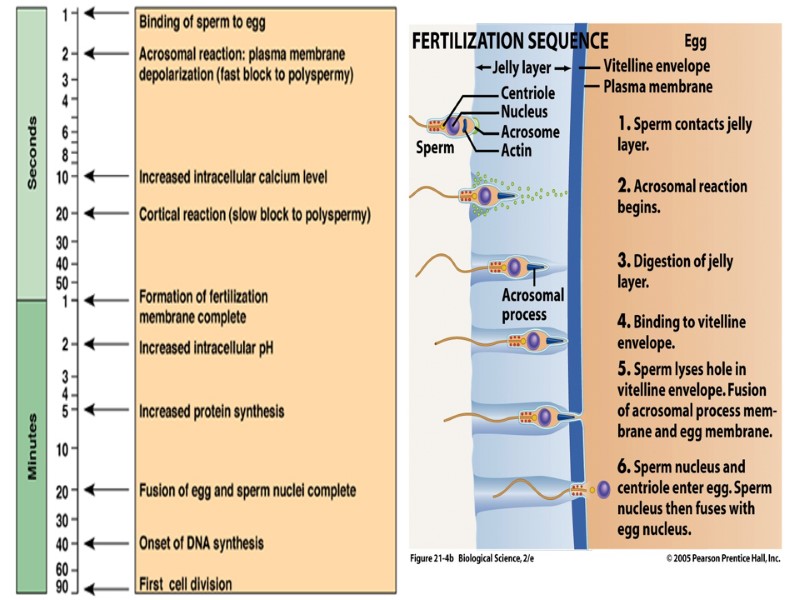 Оплодотворение Пронуклеусы перемещаются к центру яйцеклетки, происходит репликация ДНК, и после их слияния набор хромосом и ДНК зиготы становится 2n4c. Объединение пронуклеусов и представляет собой собственно оплодотворение. Таким образом, оплодотворение заканчивается образованием зиготы с диплоидным ядром. Оплодотворение — необратимый процесс, то есть однажды оплодотворенное яйцо не может быть оплодотворено вновь. Это происходит одновременно с завершением второго деления мейоза ядра яйцеклетки, которое возобновилось благодаря оплодотворению. Постепенно ядро яйцеклетки превращается в женский пронуклеус.