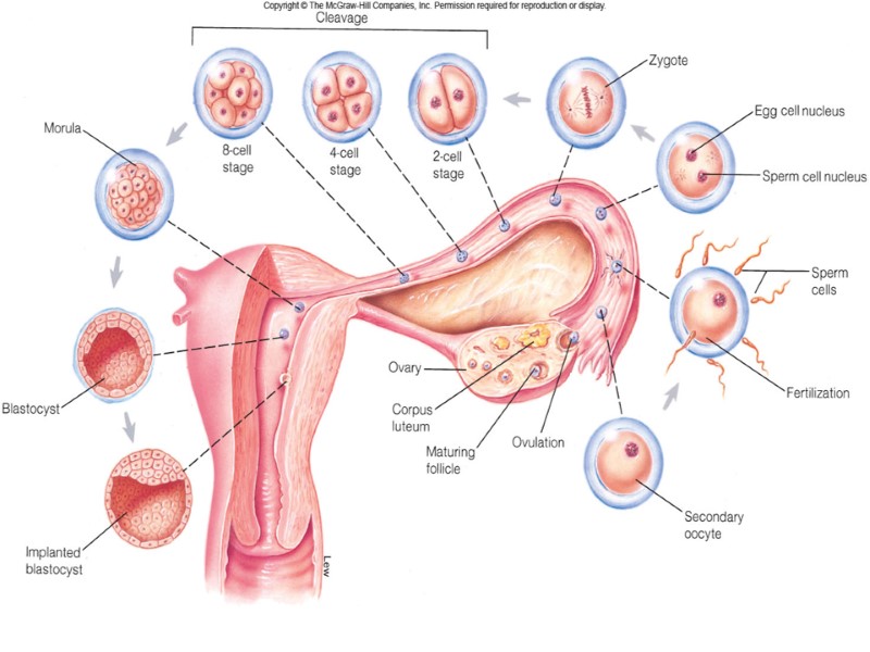 Развитие эмбриона Если оплодотворение произошло, то из зиготы развивается бластоциста, которая через восемь дней после овуляции погружается в слизистую матки. Клетки трофобласта секретируют хорионический гонадотропин, который поддерживает и усиливает работу желтого тела.
