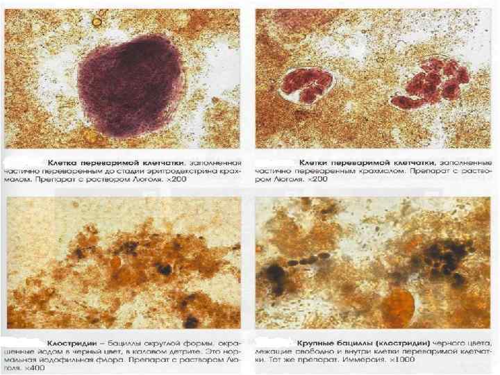 Если брожение незначительное и сочетается с процессом гниения, в кале можно обнаружить мелкие кокки и палочки. Дрожжевые грибы окрашиваются раствором Люголя в желтоватый цвет. Обнаружение их в большом количестве в свежем кале указывает на кандидамикоз.