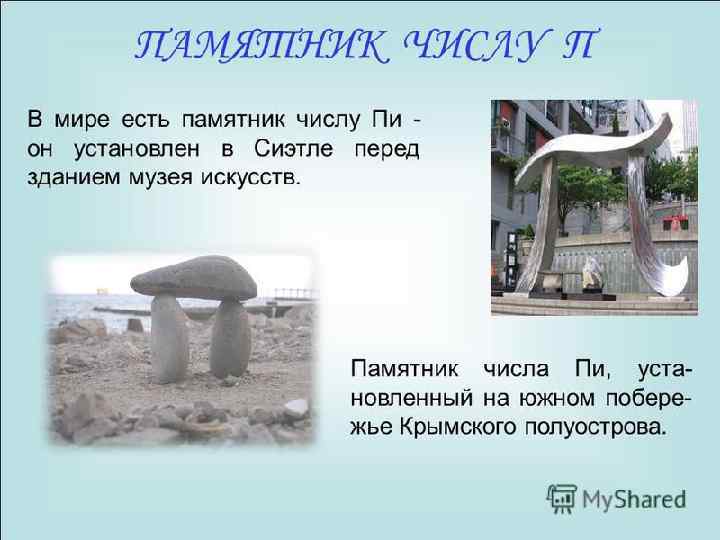 Памятник числа Пи в Волгограде возле здания музея Эйнштейна . Еще один памятник, но уже в штате Нью Джерси, США, в Парке скульптур.