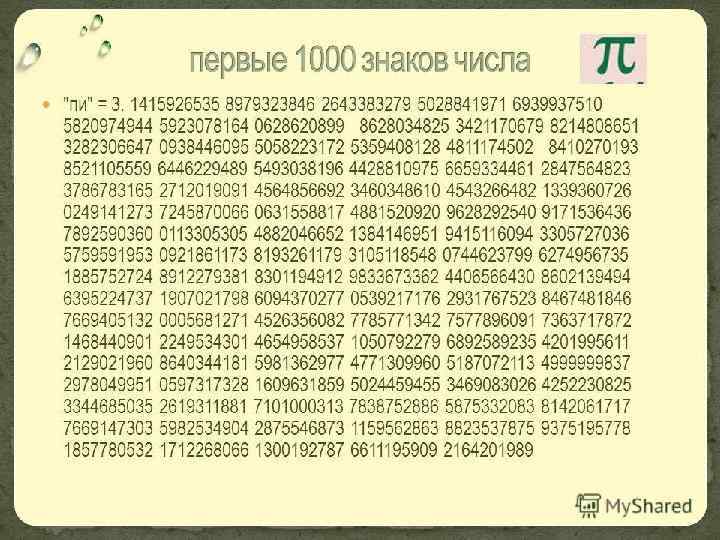 Число Пи – математическая константа, которая выражает отношение длины окружности к её диаметру. Равна приблизительно 3, 141592653589793238462643. . . Обозначается греческой буквой - π. Обозначение числа Пи буквой π впервые использовал английский математик Уильям Джонс в 1706 году в своей работе "Synopsis Palmariorum Matheseos" (что в переводе на русский язык означает "Обозрение достижений математики"). Немного позже швейцарский математик Леонард Эйлер использовал это обозначение (π) в своих работах, получивших всемирное признание. Вскоре после этого появилась тенденция к обозначению числа Пи греческой литерой π.