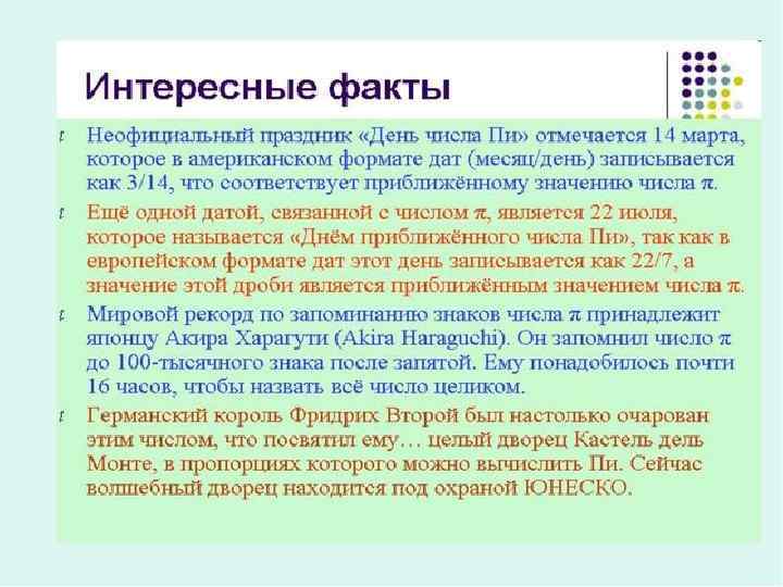 День числа Пи День π был придуман американским физиком Ларри Шоу, работавшим в музее «Эксплораториум» в Сан-Франциско. Он обратил внимание, что 14 марта ровно в 01: 59 дата и время совпадают с первыми разрядами числа π = 3, 14159. Он рекомендовал в день 14 марта есть пироги и ходить пешком по круглым площадям и помещениям