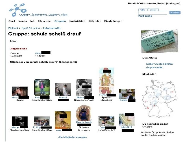 Warum das alles? • Durch Kombination verschiedener Seiten (E-mail-Adresse, Alter, Schulbesuch usw. ) kann man Personen „gläsern“ machen! • Man wird greifbar! Für JEDEN!