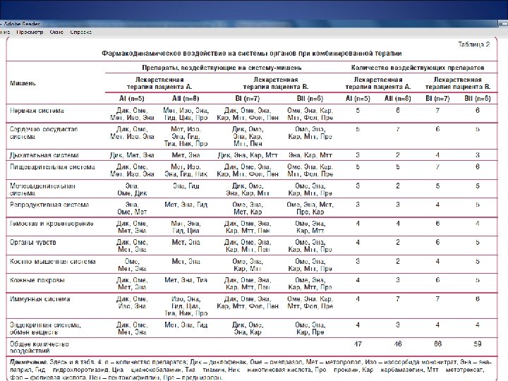 Терапевтическая адекватность режима дозирования ЛС в комбинациях Лекарственное средство Максимальная доза по инструкции Dmax Комбинация II Доза в комбинации D 1 Соотношение D 1/Dmax Доза в комбинации D 2 Соотношение D 2/Dmax A 10 5 0. 5 1 0. 1 B 100 1. 0 70 0. 7 C 1000 500 0. 5 200 0. 2 А+B+C 2, 0 1, 0 22