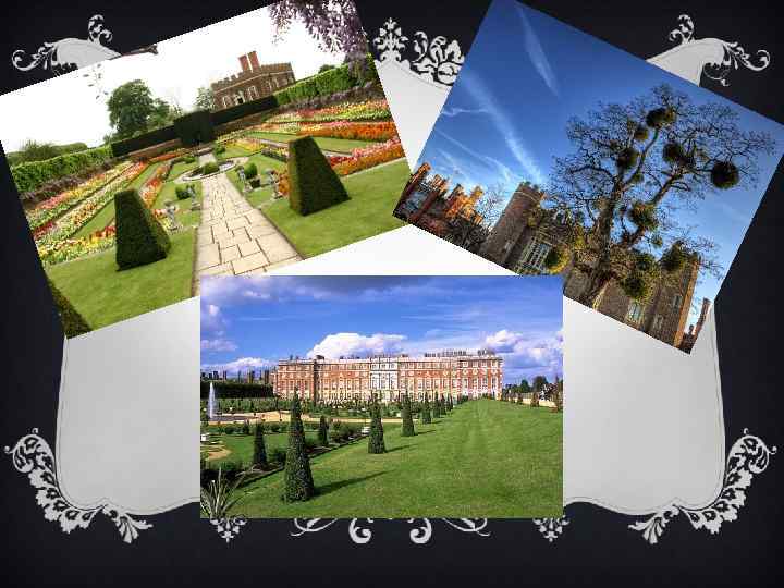 HAMPTON COURT GARDENS v It was a favorite place of Henry VIII of, located in Richmond-upon. Thames, in Greater London. This place is known as one of the most beautiful gardens in the world: Tudor style pattern - "the English version of Versailles. « v Where you can admire the ancient architecture, saved to our times and carefully protected. v Exotic trees and flowers were planted itself Elizabeth the First, the grape vine growing over 250 years and brings a crop of 900 kg!