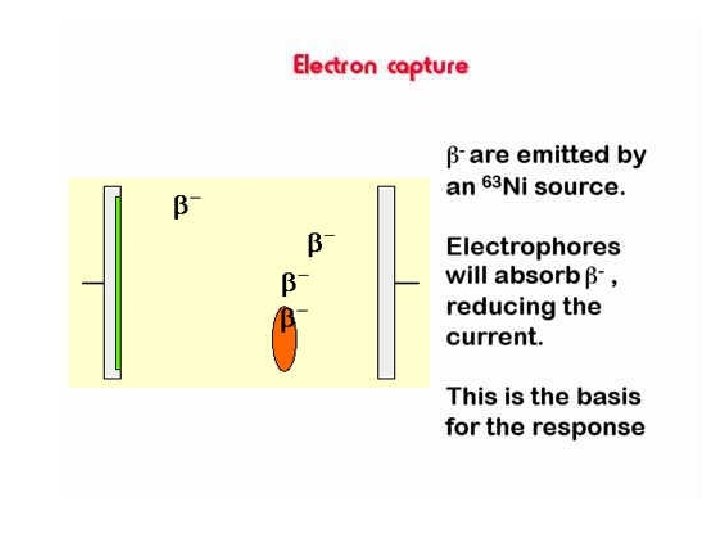 Basic Principles of ECD • Radioactive source of 3 H or 63 Ni emits particles. • Ionization : N 2 (Nitrogen carrier gas) + (e) = N 2+ + 2 e (slow electrons are formed) • The slow electrons produce a steady background current “ a base line” • X (F, Cl and Br) containing sample + (e- from the baseline current)) XIon recombination : X- + N 2+ = X + N 2 • Thus, “base line” will decrease and this decrease constitutes the signal. • Compounds detected: alkyl halides, conjugated carbonyles, nitriles, nitrates, organometallic compounds, Insecticides, pesticides, vinyl chloride, and fluorocarbons