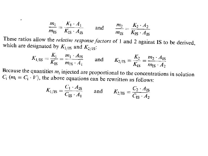 Calculation of relative response factors • A solution containing compound 1 at known concentration C 1, compound 2 at concentration C 2 and the internal standard at known concentration CIS is prepared. • Assuming that A 1, A 2 and Al. S represent the areas of the elution peaks. • The quantities of each compound are m 1, m 2 and MIS. • Given that mi = Ki Ai; thus – m 1 = K 1 A 1 ; m 2 = K 2 A 2 ; m 3 = K 3 A 3 • Relative response factor can be derived as follows: