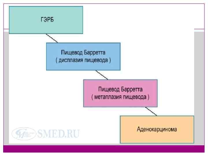 Заключение Длительное течение ГЭРБ при отсутствии адекватного лечения может приводить к осложнениям в виде эрозий, язв пищевода, кровотечению из язв пищевода, образованию рубцовых изменений – стриктур, которые сужают просвет пищевода, нарушают прохождение пищи и ведут к развитию предраковых заболеваний (пищевод Баррета) и рака пищевода. Внепищеводные осложнения: развитие бронхиальной астмы, хронического бронхита, аспирационной пневмонии. Своевременная диагностика и систематическое лечение позволяет предупредить прогрессирование заболевания и развития опасных для жизни осложнений.