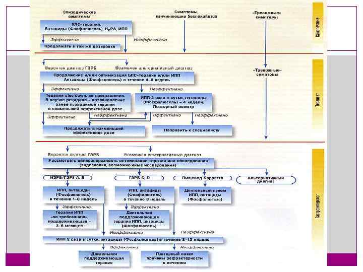 Ингибиторы протонной помпы. Оптимальные результаты лечения получены применении самых мощных ингибиторов кислотной продукции игибиторов протонной помпы. В настоящее время рекомендовано испоьзовать ингибиторы протонной помпы в качестве начальной терапии любой формы ГЭРБ. Они обладают наилучшим соотношением « стоимость – эффективность» среди всех препаратов, применяемых для лечения ГЭРБ. Длительность основного курса лечения при эрозивной ГЭРБ всеми ингибиторами протонной помпы составляет 4 8 недель, что определяется скоростью купирования симптоматики и динамикой эндоскопической картины. омепразол ( Лосек МАПС , Ультоп , Омез ) 20 мг 2 раза в сутки. ланзопразол ( Ланзоптол ) 30 60 мг/сутки. рабепразол ( Париет ) 20 40 мг/сутки. эзомепразол ( Нексиум ) 40 мг/сутки.