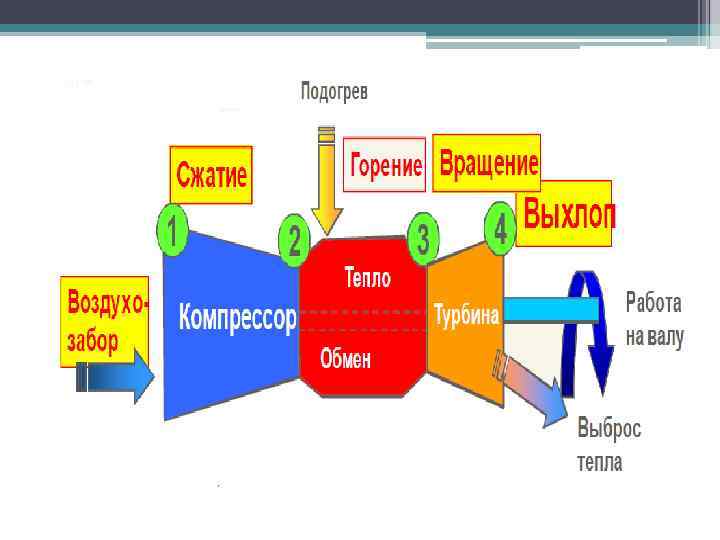 Газовая турбина состоит из дисков турбины и компрессора, установленных на одном валу. Турбина работает так: воздух нагнетается компрессором в камеру сгорания турбины, куда затем впрыскивается жидкое горючее. Горючая смесь сгорает при очень высокой температуре, газы расширяются, устремляются к выхлопному отверстию, по пути попадают на лопатки турбины и приводят их во вращение.