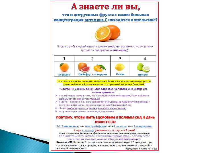 Заключение Окружающие считают, что наибольшее количество витамина С в лимоне. Чаще всего люди употребляют витамин С в цитрусовых, но не каждый день. Наиболее кислая среда у лимона, наименее кислая – у мандарина. Наибольшая концентрация витамина С содержится в апельсине, второе место по содержанию занимают- грейпфрут и мандарин(Марокко); третье место-лимон; в остальных цитрусовых содержание витамина С примерно одинаковое По результатам исследования, лучше всего для употребления подходит апельсин, так как менее «кислый» и больше всего содержит витамина С.