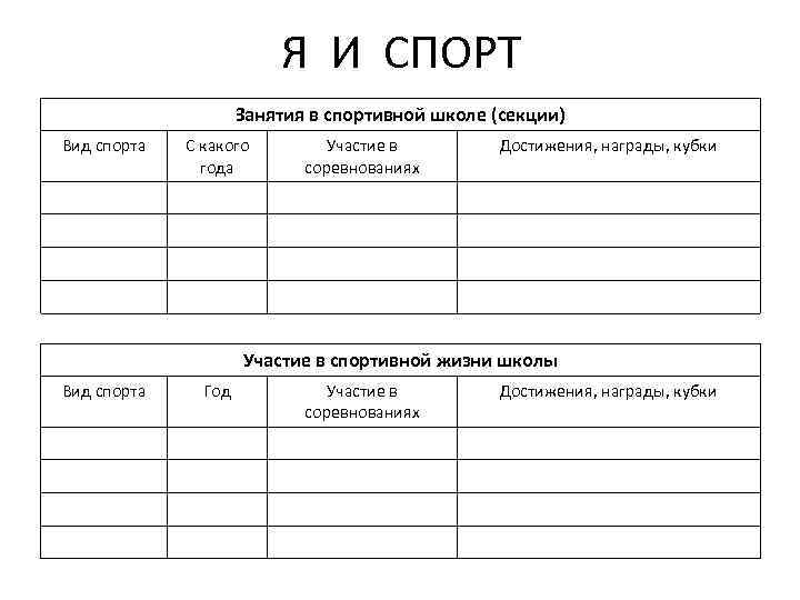 Я И СПОРТ Занятия в спортивной школе (секции) Вид спорта С какого года Участие в соревнованиях Достижения, награды, кубки Участие в спортивной жизни школы Вид спорта Год Участие в соревнованиях Достижения, награды, кубки