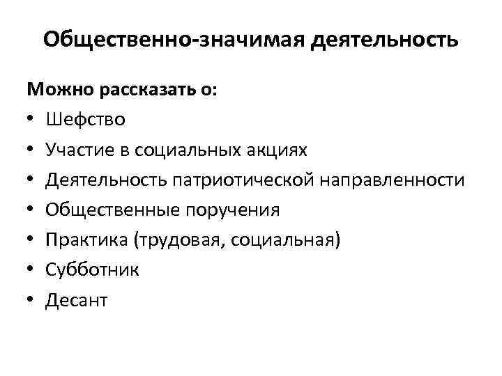 Общественно-значимая деятельность Можно рассказать о: • Шефство • Участие в социальных акциях • Деятельность патриотической направленности • Общественные поручения • Практика (трудовая, социальная) • Субботник • Десант
