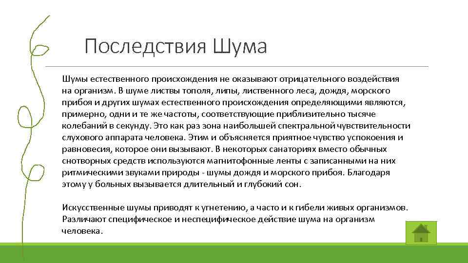 Последствия Шума Шумы естественного происхождения не оказывают отрицательного воздействия на организм. В шуме листвы тополя, липы, лиственного леса, дождя, морского прибоя и других шумах естественного происхождения определяющими являются, примерно, одни и те же частоты, соответствующие приблизительно тысяче колебаний в секунду. Это как раз зона наибольшей спектральной чувствительности слухового аппарата человека. Этим и объясняется приятное чувство успокоения и равновесия, которое они вызывают. В некоторых санаториях вместо обычных снотворных средств используются магнитофонные ленты с записанными на них ритмическими звуками природы - шумы дождя и морского прибоя. Благодаря этому у больных вызывается длительный и глубокий сон. Искусственные шумы приводят к угнетению, а часто и к гибели живых организмов. Различают специфическое и неспецифическое действие шума на организм человека.