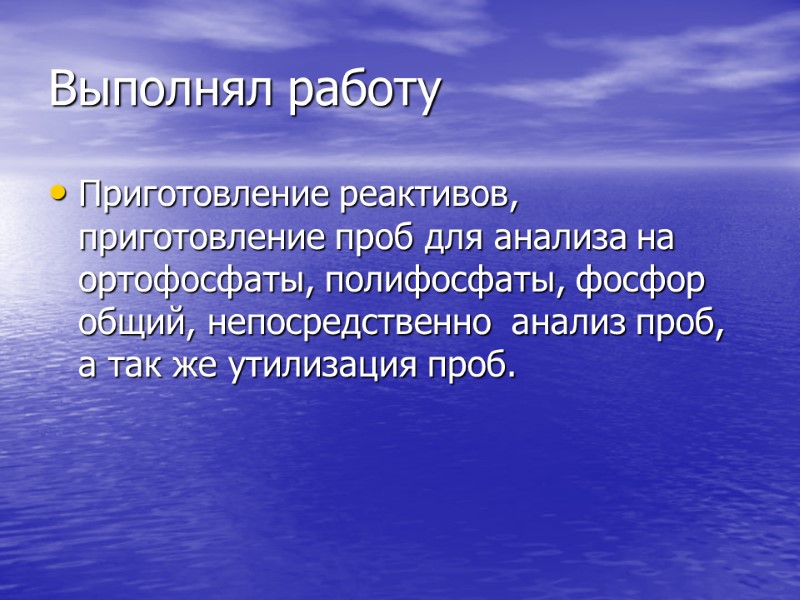 Выполнял работу Приготовление реактивов, приготовление проб для анализа на ортофосфаты, полифосфаты, фосфор общий, непосредственно анализ проб, а так же утилизация проб.