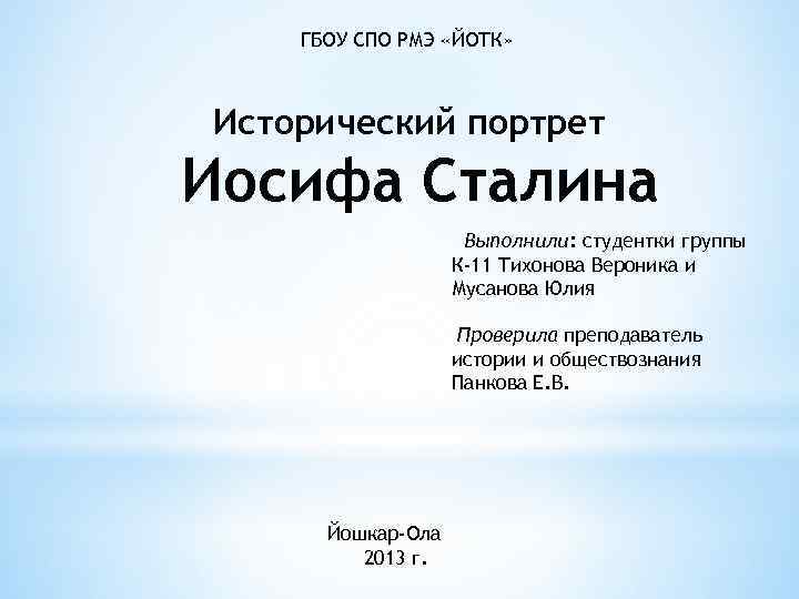 ГБОУ СПО РМЭ «ЙОТК» Исторический портрет Иосифа Сталина Выполнили: студентки группы К-11 Тихонова Вероника и Мусанова Юлия Проверила преподаватель истории и обществознания Панкова Е. В. Йошкар-Ола 2013 г.
