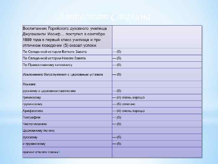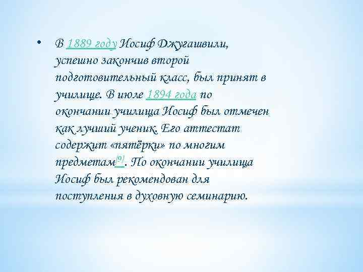 • В 1889 году Иосиф Джугашвили, успешно закончив второй подготовительный класс, был принят в училище. В июле 1894 года по окончании училища Иосиф был отмечен как лучший ученик. Его аттестат содержит «пятёрки» по многим предметам[9]. По окончании училища Иосиф был рекомендован для поступления в духовную семинарию.
