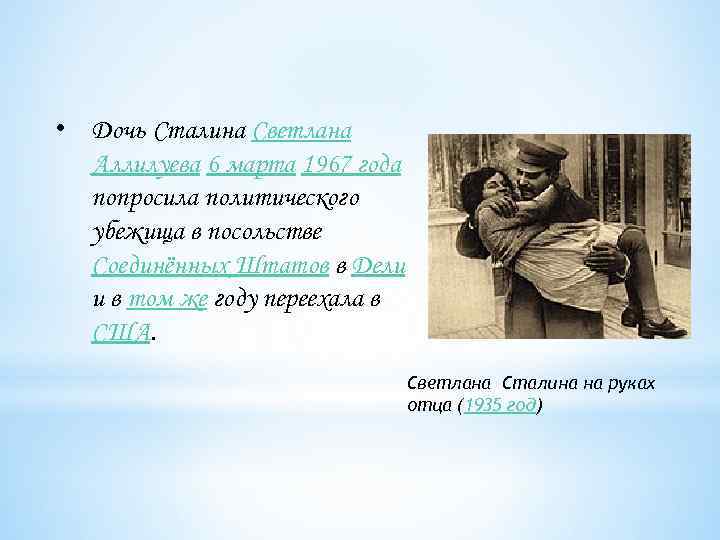 • Дочь Сталина Светлана Аллилуева 6 марта 1967 года попросила политического убежища в посольстве Соединённых Штатов в Дели и в том же году переехала в США. Светлана Сталина на руках отца (1935 год)