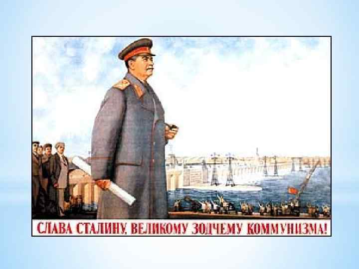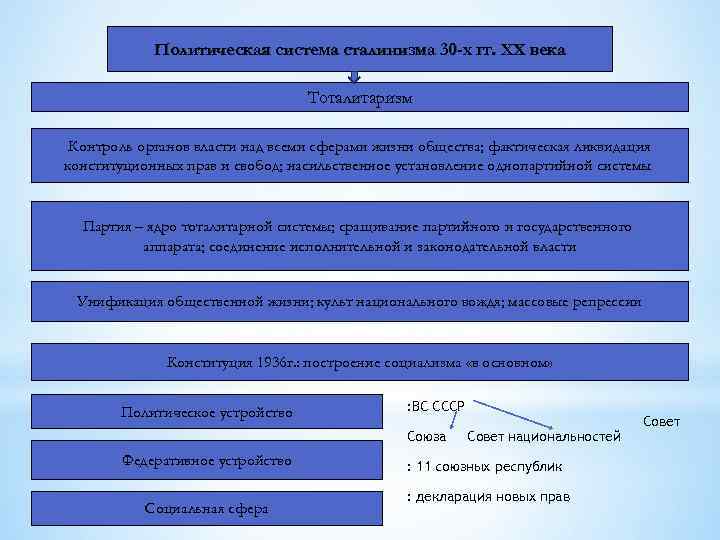Политическая система сталинизма 30 -х гг. XX века Тоталитаризм Контроль органов власти над всеми сферами жизни общества; фактическая ликвидация конституционных прав и свобод; насильственное установление однопартийной системы Партия – ядро тоталитарной системы; сращивание партийного и государственного аппарата; соединение исполнительной и законодательной власти Унификация общественной жизни; культ национального вождя; массовые репрессии Конституция 1936 г. : построение социализма «в основном» Политическое устройство : ВС СССР Союза Федеративное устройство Социальная сфера Совет национальностей : 11 союзных республик : декларация новых прав Совет