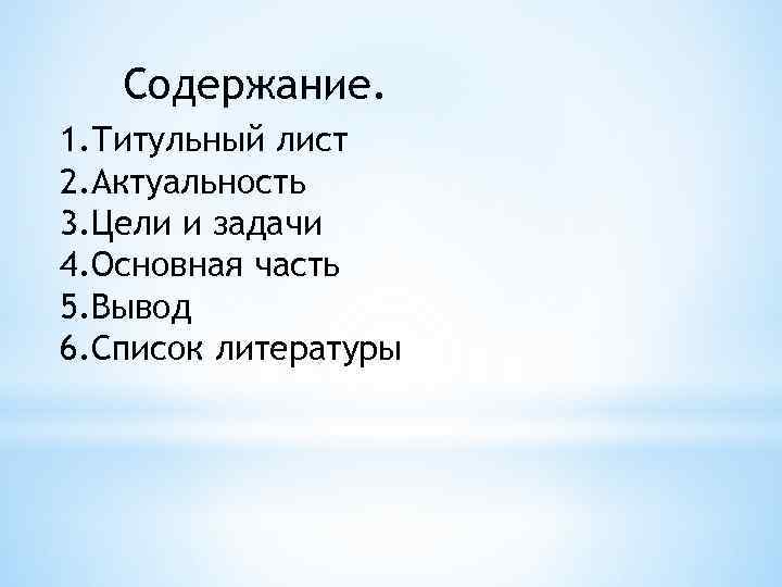Содержание. 1. Титульный лист 2. Актуальность 3. Цели и задачи 4. Основная часть 5. Вывод 6. Список литературы