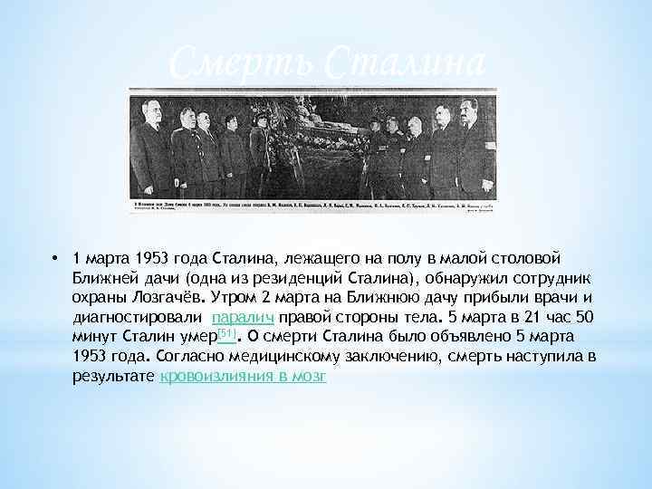 Смерть Сталина • 1 марта 1953 года Сталина, лежащего на полу в малой столовой Ближней дачи (одна из резиденций Сталина), обнаружил сотрудник охраны Лозгачёв. Утром 2 марта на Ближнюю дачу прибыли врачи и диагностировали паралич правой стороны тела. 5 марта в 21 час 50 минут Сталин умер[51]. О смерти Сталина было объявлено 5 марта 1953 года. Согласно медицинскому заключению, смерть наступила в результате кровоизлияния в мозг