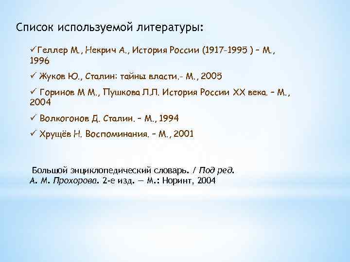 Список используемой литературы: üГеллер М. , Некрич А. , История России (1917 -1995 ) – М. , 1996 ü Жуков Ю. , Сталин: тайны власти. - М. , 2005 ü Горинов М М. , Пушкова Л. Л. История России XX века. – М. , 2004 ü Волкогонов Д. Сталин. – М. , 1994 ü Хрущёв Н. Воспоминания. – М. , 2001 Большой энциклопедический словарь. / Под ред. А. М. Прохорова. 2 -е изд. — М. : Норинт, 2004