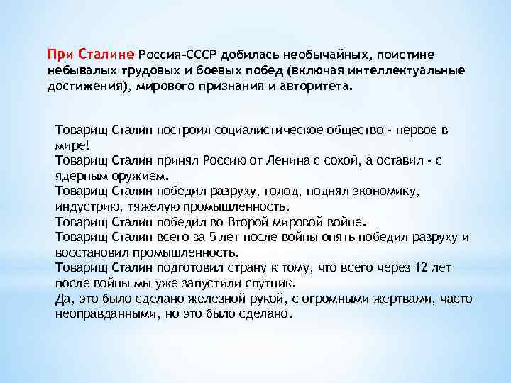 При Сталине Россия-СССР добилась необычайных, поистине небывалых трудовых и боевых побед (включая интеллектуальные достижения), мирового признания и авторитета. Товарищ Сталин построил социалистическое общество - первое в мире! Товарищ Сталин принял Россию от Ленина с сохой, а оставил - с ядерным оружием. Товарищ Сталин победил разруху, голод, поднял экономику, индустрию, тяжелую промышленность. Товарищ Сталин победил во Второй мировой войне. Товарищ Сталин всего за 5 лет после войны опять победил разруху и восстановил промышленность. Товарищ Сталин подготовил страну к тому, что всего через 12 лет после войны мы уже запустили спутник. Да, это было сделано железной рукой, с огромными жертвами, часто неоправданными, но это было сделано.