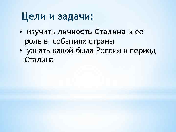Цели и задачи: • изучить личность Сталина и ее роль в событиях страны • узнать какой была Россия в период Сталина