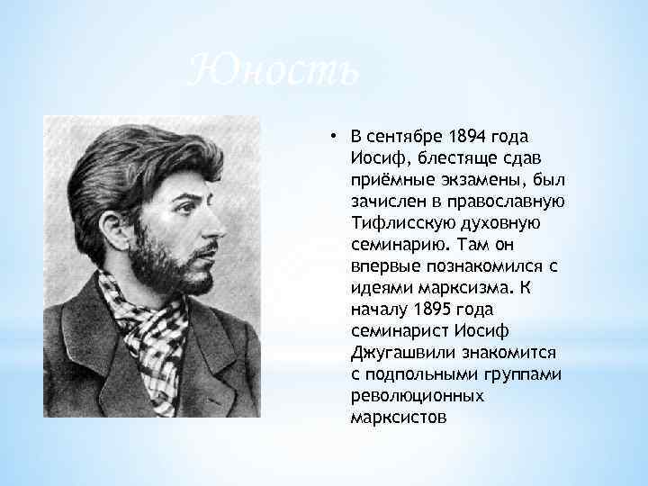 Юность • В сентябре 1894 года Иосиф, блестяще сдав приёмные экзамены, был зачислен в православную Тифлисскую духовную семинарию. Там он впервые познакомился с идеями марксизма. К началу 1895 года семинарист Иосиф Джугашвили знакомится с подпольными группами революционных марксистов