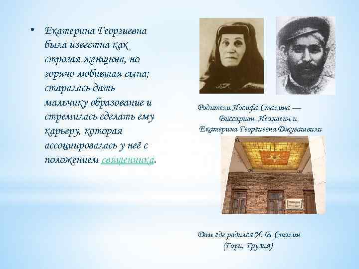 • Екатерина Георгиевна была известна как строгая женщина, но горячо любившая сына; старалась дать мальчику образование и Родители Иосифа Сталина — стремилась сделать ему Виссарион Иванович и Родители Иосифа Сталина —Екатерина Георгиевна Джугашвили карьеру, которая Виссарион Иванович и ассоциировалась у неёГеоргиевна Джугашвили Екатерина с положением священника. Дом где родился И. В. Сталин (Гори, Грузия)