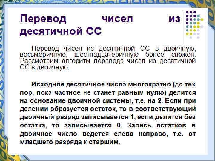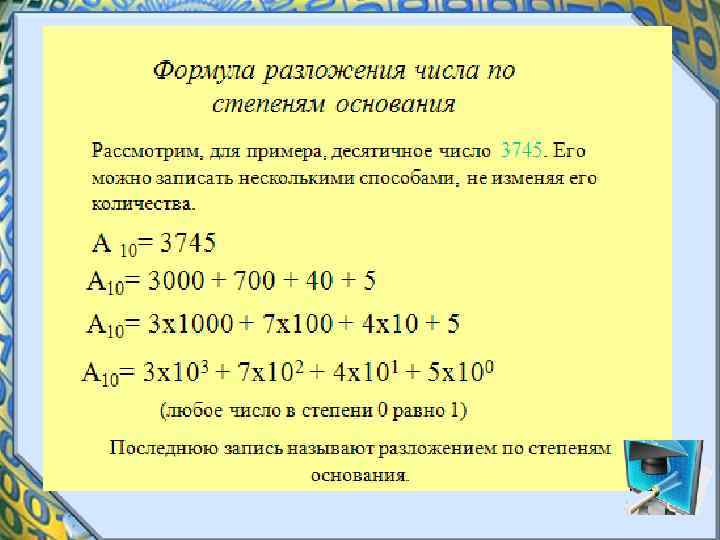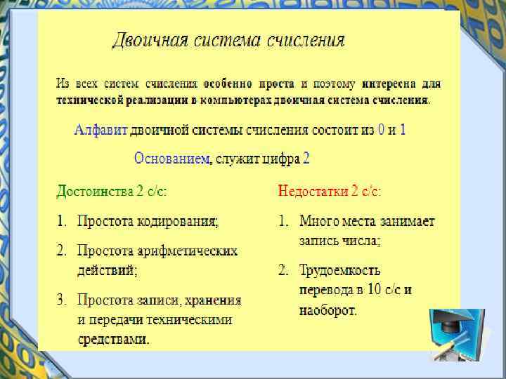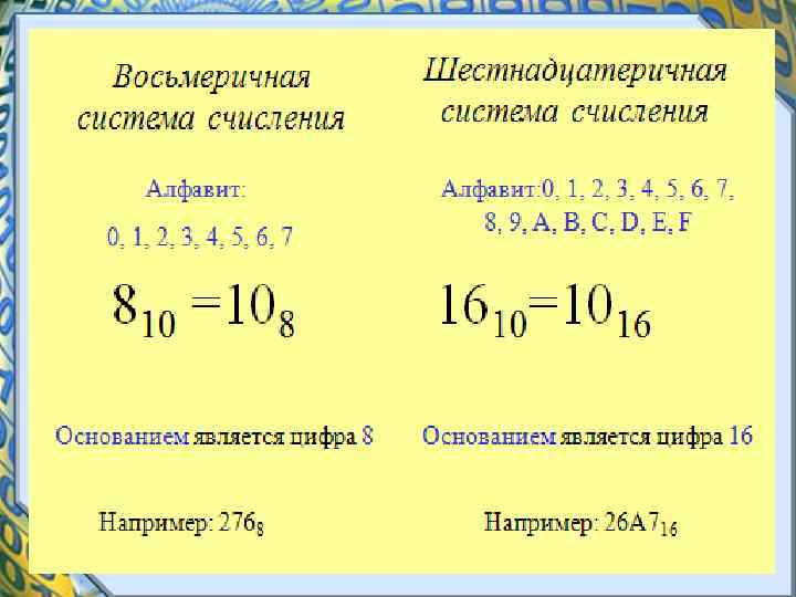 Системы счисления • Любая позиционная система счисления характеризуется своим основанием. • Основание позиционной системы счисления - это количество различных символов, используемых для изображения чисел в данной системе счисления.
