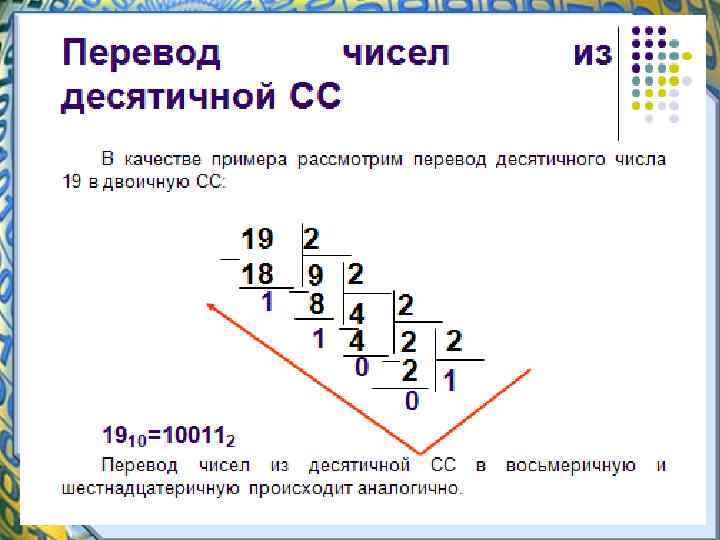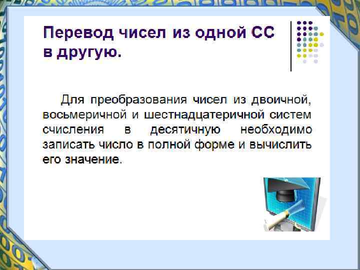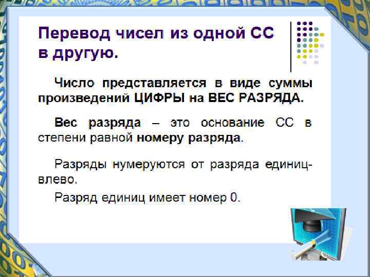 Алгоритм перевода целого числа из системы счисления с основанием q (2, 8, 16) в десятичную систему счисления. • 1. Определяем разряд каждой цифры в числе (разряды выставляются строго над цифрами справа налево, начиная с нуля) • 2. Умножаем цифру числа на основание в степени, равной номеру разряда. • 3. Суммируем все произведения.