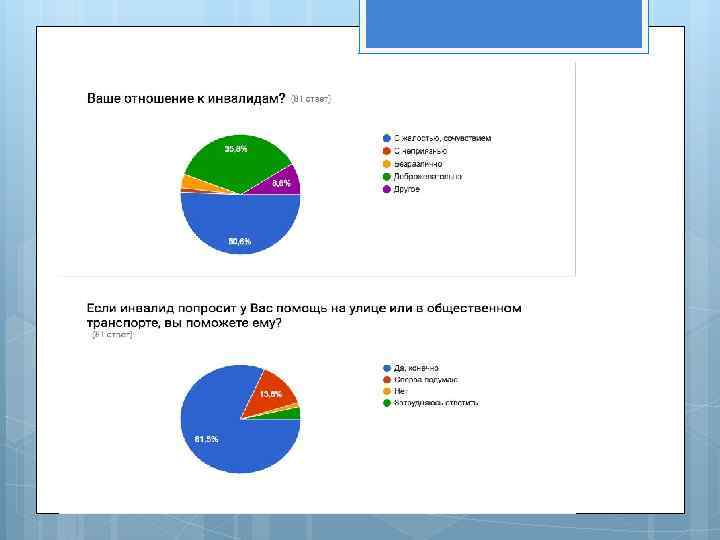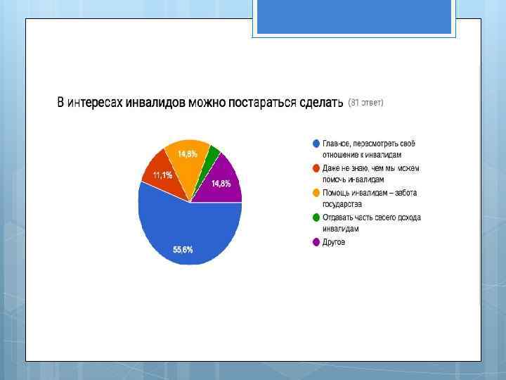 Вывод: Люди с ОВЗ могут жить и радоваться жизни наравне с обычными людьми, для этого обществу нужно найти «золотую середину» отношения к инвалидам как к обыкновенным людям, вместе с этим проявляя доброту и помощь, когда люди с ОВЗ в этом нуждаются.