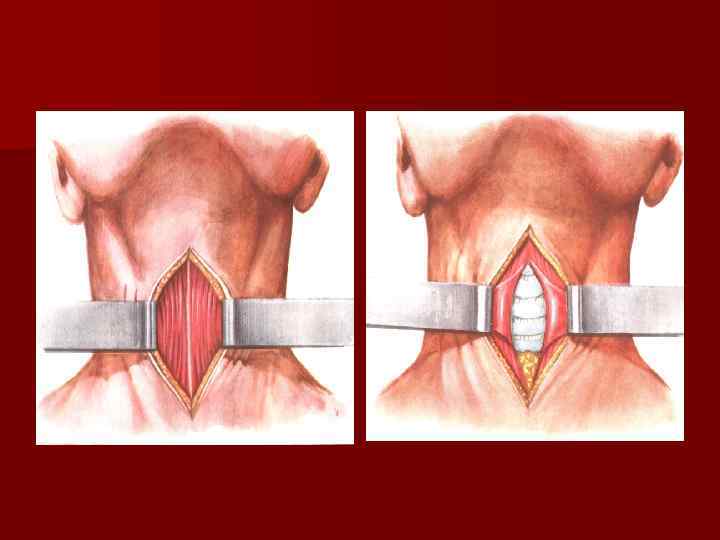 Трахеостомия n Операция по рассечению дыхательного горла с подшиванием слизистой оболочки трахеи к краям разреза или с введением в просвет трахеи канюли через трахеотомическое отверстие называется трахеостомией.
