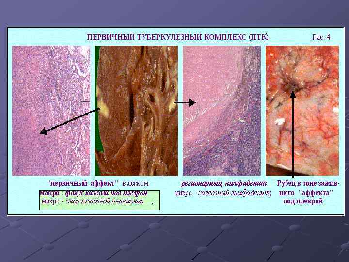 КЛИНИКО-МОРФОЛОГИЧЕСКИЙ ФОРМЫ ПЕРВИЧНОГО ТУБЕРКУЛЕЗА ХРОНИЧЕСКОЕ ТЕЧЕНИЕ ПЕРВИЧНОГО ТУБЕРКУЛЕЗНОГО КОМПЛЕКСА: - туберкулезный лимфаденит; - первичная туберкулезная каверна ПРОГРЕССИРОВАНИЕ ПЕРВИЧНОГО ТУБЕРКУЛЕЗНОГО КОМПЛЕКСА: - рост первичного аффекта – казеозная пневмония; - лимфожелезистый вариант – лимфонодулярная каверна с аденогенными осложнениями (лимфонодулобронхиальные и пищеводные свищи, сосудистые фистулы, кровотечения, аспирационные пневмонии); - генерализация процесса – милиарная, крупно-очаговая диссеминация, реже – туберкулезный сепсис (тифобациллез Ландузи); - смешанное.