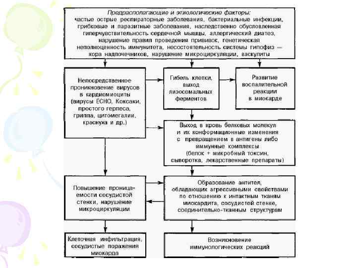 Этиология • Вирусный (Коксаки (типа А и В), ЕСНО, грипп, краснуха, ветряная оспа, герпес) • Бактериальный (дифтерия, брюшной тиф) • Паразитарный (токсоплазмоз, гистоплазмоз, шистосомоз) • Грибковый (кокцидиомикоз) • Аллергический (лекарства, сыворотка, вакцина)