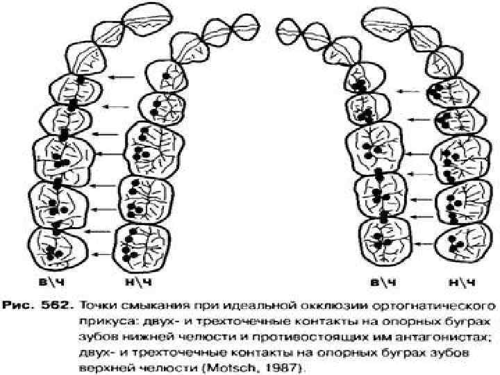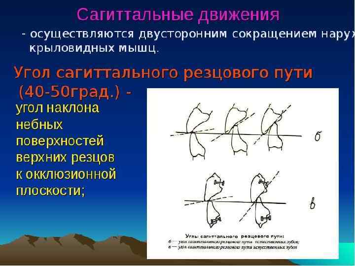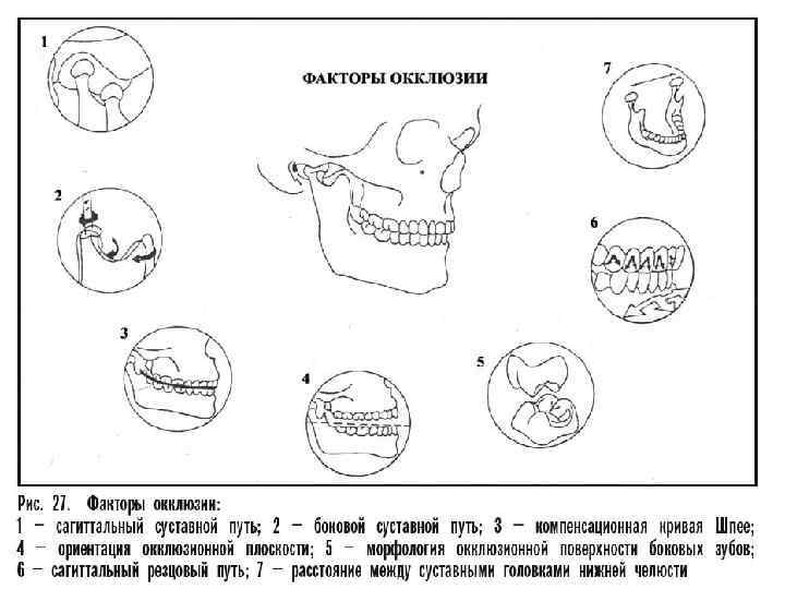 На характер контактов задних зубов при движениях нижней челюсти оказывает влияние несколько различных факторов. Их называют «факторами окклюзии» . К ним относятся: суставной путь; движение Беннетта — боковое движение рабочей суставной головки, в среднем составляет 1 мм; окклюзионная плоскость — средний уровень жевательных поверхностей по отношению к горизонтали; кривая Шпее — дистальное и верхнее искривление окклюзионной плоскости; кривая Уилсона — искривление окклюзионной плоскости, рассматриваемое во фронтальной плоскости; морфология жевательной поверхности задних зубов — высота бугров, глубина ямок, направление краевых выступов и бороздок, а также угол наклона скатов бугров составляют элементы морфологии окклюзионной поверхности, которые влияют на характер контакта задних зубов во время движений нижней челюсти; резцовый путь — путь, совершаемый нижними резцами при выдвижении нижней челюсти вперед; расстояние между суставными головками.