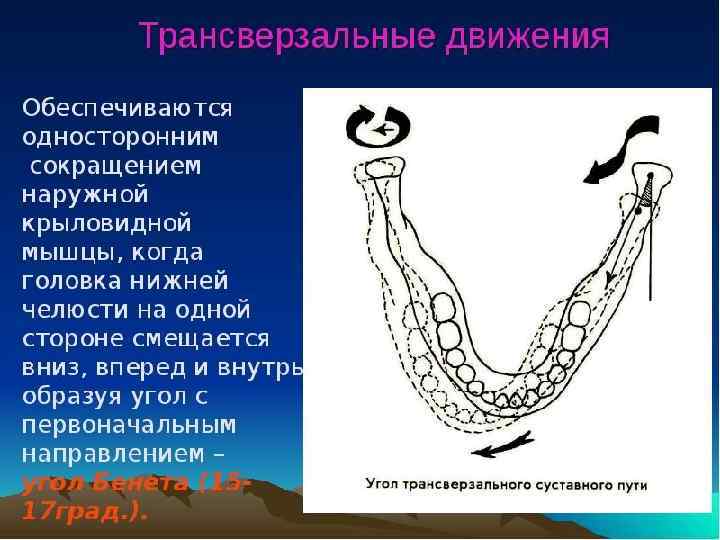 Трансверзальные (боковые) движения нижней челюсти осуществляются в результате преимущественно одностороннего сокращения латеральной крыловидной мышцы. При движении нижней челюсти вправо сокращается левая латеральная крыловидная мышца и наоборот. При этом головка нижней челюсти на рабочей стороне (сторона смещения) вращается вокруг вертикальной оси. На противоположной балансирующей стороне (сторона сократившейся мышцы) головка нижней челюсти скользит вместе с диском по суставной поверхности бугорка вниз, вперед и несколько внутрь, совершая боковой суставной путь. Угол, образованный между линиями сагиттального и трансверзального суставного пути, называется углом трансверзального суставного пути. В литературе он известен под названием «угол Беннета» и равен, в среднем, 17°. Трансверзальные движения характеризуются определенными изменениями в положении зубов. Кривые боковых перемещений передних зубов в межрезцовой точке пересекаются под тупым углом. Этот угол называется готическим или углом трансверзального резцового пути. Он определяет размах резцов при боковых движениях нижней челюсти и равен в среднем 100 -110°.