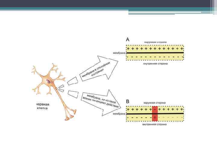 ВОЗНИКНОВЕНИЕ И ПРОВЕДЕНИЕ НЕРВНОГО ВОЗБУЖДЕНИЯ Основное свойство нейрона – способность возбуждаться (генерировать электрический импульс) и передавать (проводить) это возбуждение к другим клеткам (нейронам, миоцитам, железистым клеткам и т. д. ). 1. Основная роль – трехслойной мембране (7 – 11 нм) с «встроенными» ионными каналами (Na, K, Ca, Cl) и рецепторами (для молекул БАВ). 2. Ионные каналы мембраны (ионные насосы) создают разность концентраций ионов внутри и вне клетки. 3. В результате внутренняя сторона мембраны заряжается отрицательно (от -70 м. В до -90 м. В) относительно внешней стороны – потенциал покоя.