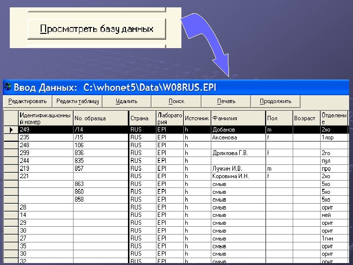 Программа WHONET Разработчик: World Health Organization – Всемирная Организация Здравоохранения система управления базами данных; предназначена для обработки результатов исследований чувствительности микроорганизмов к антимикробным препаратам; используется как в повседневной, так и научной практике.