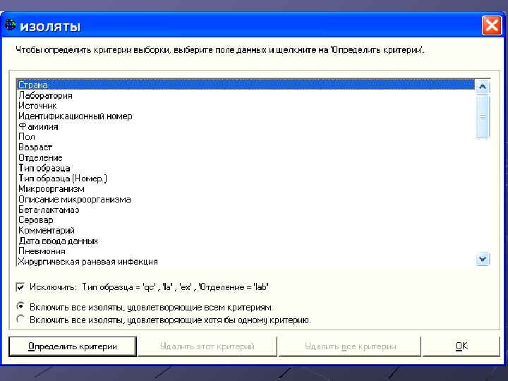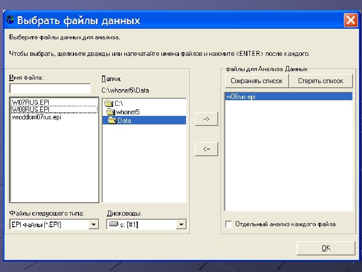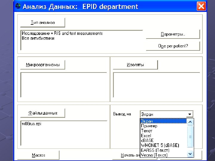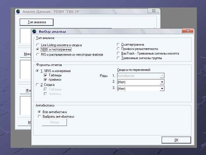 Анализ данных Создание сводок данных (line listing) % резистентных и чувствительных культур Анализ одновременно по нескольким файлам Графики рассеивания (скаттерграммы) Профили резистентности Bac. Track – оценка тревожных сигналов о штамме или группе штаммов