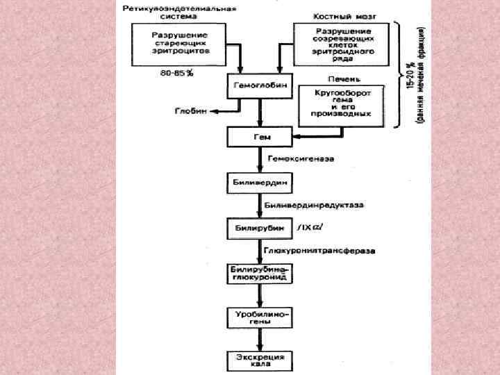 Клинические аспекты • Билирубин образуется при распаде гемоглобина в клетках ретикулоэндотелиальной системы (РЭС), особенно активно в селезенке и в купфферовских клетках печени. У взрослого человека образуется 250 -350 мг билирубина в сутки. Билирубин слаборастворим в воде, в плазме билирубин первично появляется в неконъюгированной форме, связанный с альбумином (непрямой, свободный билирубин). Неконъюгированный билирубин не может проникнуть через почечный барьер. В печени происходит переход билирубина от альбумина на синусоидальную поверхность гепатоцитов. В клетках печени непрямой билирубин подвергается энзиматической конъюгации с глюкуроновой кислотой и превращается в билирубинмоно- и билирубиндиглюкоронид (конъюгированный, прямой, связанный билирубин).