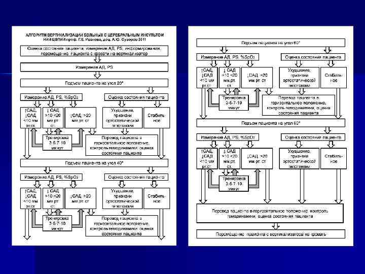 Оценка состояния пациента, измерение АД, PS, информирование, перемещение пациента с кровати на вертикализатор Измерение АД, PS, %Sp. O 2 Подъем пациента на угол 20° Измерение АД, PS, %Sp. O 2 ↑САД, ↓САД <10 мм рт. ст. ↓ САД >10 <20 мм. рт. ст. Оценка состояния пациента ↓САД >20 мм. рт. ст Тренировка 3 -5 -7 -10 минут Ухудшение, признаки ортостатической гипотензии Стабильное Перевод пациента в горизонтальное положение, контроль гемодинамики, оценка состояния пациента Подъем пациента на угол 40°