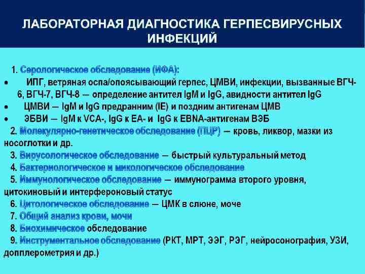 ВСЕ ГЕРПЕСВИРУСНЫЕ ИНФЕКЦИИ 1. Серологические маркеры (ИФА): Ig. M-антитела Увеличение титра Ig. G в четыре и более раз в парных сыворотках Низкая и средняя авидность Ig. G-антител (менее 50%) 2. Молекулярно-генетические маркеры (ПЦР) ― ДНК герпесвирусов в крови и ликворе ЦМВИ 1. Серологические маркеры (ИФА): антитела Ig. M и Ig. G-АТ к предранним (IE) белкам ЦМВ 2. Цитологические маркеры ― ЦМК в слюне и моче ЭБВИ Серологические маркеры (ИФА) ― Ig. M-антитела к капсидному антигену (VCA), Ig. G- антитела к раннему антигену (ЕА)