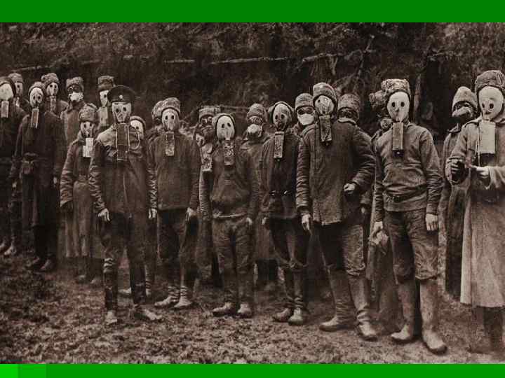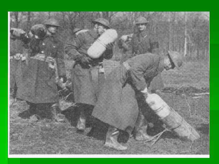 Химическая война 22 апреля 1915 в 17 часов со стороны немецких позиций севернее бельгийского города Ипра на фронте появился серо-зеленый туман, накрывший через несколько минут опорные пункты французких войск. Всего в течении 5 минут немцы выпустили из баллонов примерно 180 тонн хлора. В результате газовой атаки было поражено 15 000 человек, из которых 5 000 погибли в течение следующих 1 -2 суток. Именно это химическое нападение принято считать началом химической войны ХХ века. В ходе I мировой войны применено 130 000 т 40 видов ОВ 1 300 000 человек получили поражения, более 100 000 человек погибли
