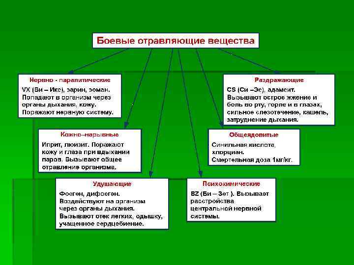 Химическое оружие различают по следующим характеристикам: — характеру физиологического воздействия ОВ на организм человека — тактическому назначению — быстроте наступающего воздействия — стойкости применяемого ОВ — средствам и способам применения